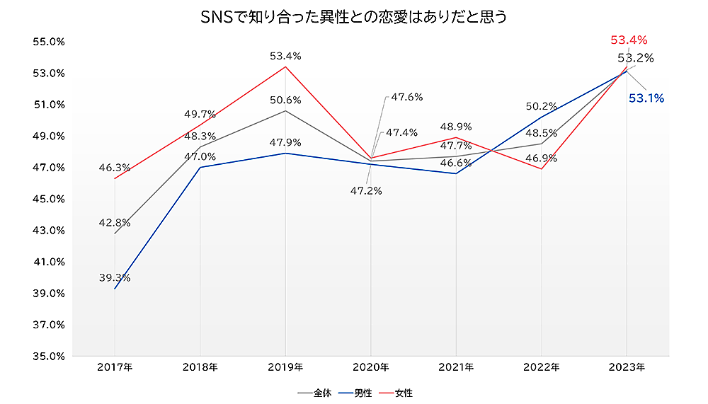 そこで「SNSで知り合った異性との恋愛はありか?」と聞くと、全体で53.2%が「あり」と回答しており、男性は53.1%で過去7年最高。女性も53.4%と半数を超えている。こうした考えを踏まえ、ネット(SNS・アプリ)が出会いの機会を増やしていると考えられる。