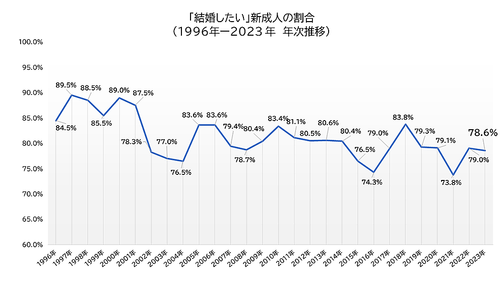 結婚については、「早く結婚したい」「いずれは結婚したい」と回答した人は全体の78.6%で、前年79.0%とほぼ変わらないが、緩やかな減少が続いている。