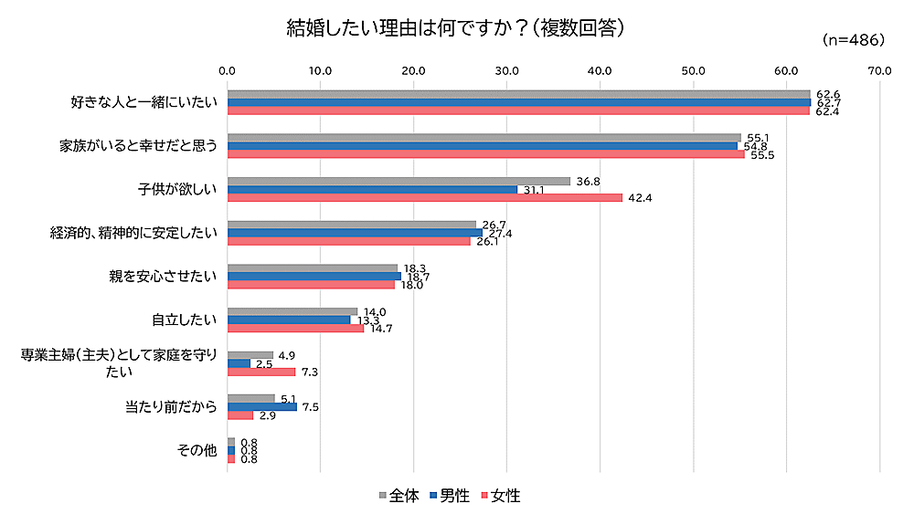 「結婚したい」理由では、「好きな人といっしょにいたい」 「子供が欲しい」 「家族がいると幸せ」の3つが例年どおり上位。ただし「子供が欲しい」は前年の49.8%から13ポイント大幅に減少しており、過去6年間で最低を記録した。逆に4位「経済的、精神的に安定したい」26.7%は前年16.0%から10.7ポイント増加し過去6年間の最高値となっている。