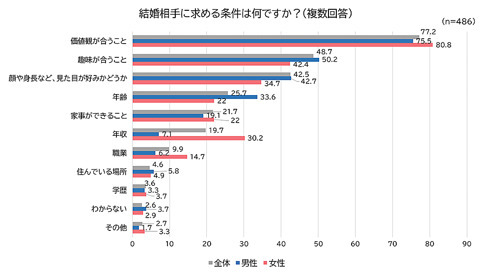 最後に「結婚相手に求める条件」を聞くと、「価値観が合うこと」「趣味が合うこと」「顔や身長など、見た目が好みかどうか」が上位だった。