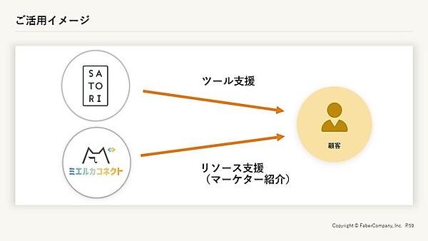 Webマーケターマッチングの「ミエルカコネクト」を運営するFaber Company(ファベルカンパニー)と、マーケティングオートメーション(MA)ツール「SATORI」を開発・提供するSATORIは、双方のサービスを活用したマーケティング支援サービスの提供を始めた、と1月10日発表した。MA運用経験が豊富な人材の紹介と、MAツールのSATORIが連携して、MA導入から効果の出るMA運用までのパッケージプランを提供する。