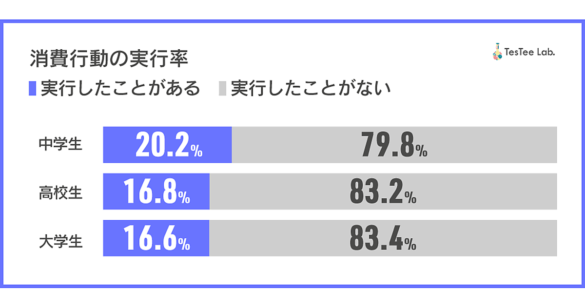 「YouTubeやYouTuberに関連することで消費行動を実行したことがあるか」(お金を使った経験があるかどうか)を聞くと、「ある」と回答した人は中学生20.2%、高校生16.8%、大学生16.6%で若いほど多い。ただし前回調査(2022年上半期)からの変化を見ると、いずれの年代でも消費行動の実行率は減少している。