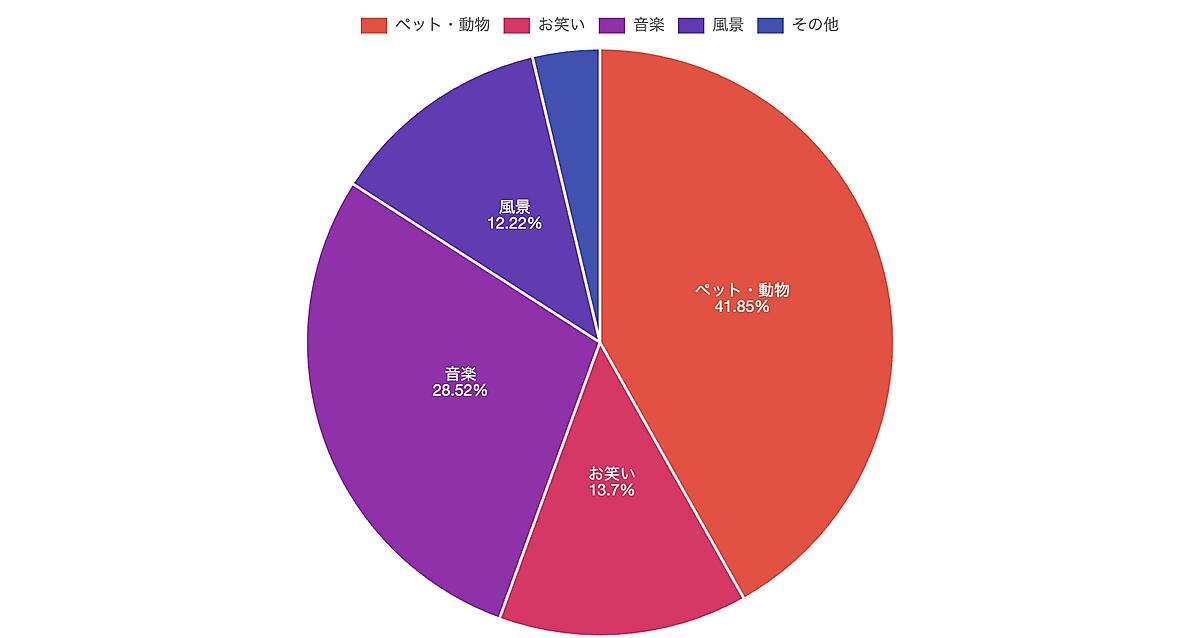 ちなみに「SNSを利用していて見かけたら、癒されると思うカテゴリ」では、「ペット・動物」41.85%、「音楽」28.52%、「お笑い」13.7%が上位だった。