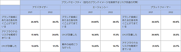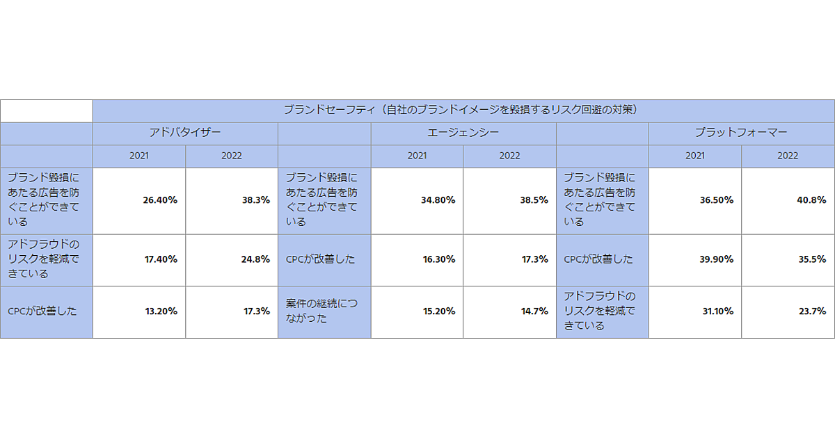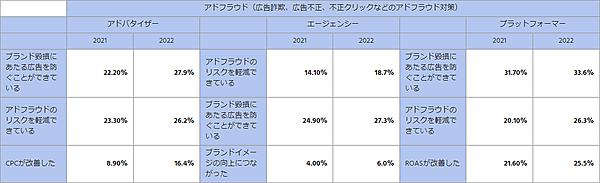 まず「該当するアドベリフィケーション対策(ブランドセーフティ、アドフラウド、ビューアビリティなど)に取り組んだ結果、現時点でどのような効果が出ているか」を対策している事業者に聞くと、以下の回答が得られた。いずれの対策も奏功していると思われる。