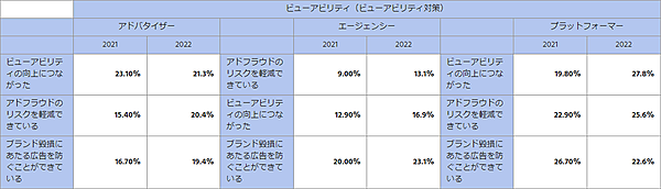 電通デジタルとモメンタムは、2022年版「アドベリフィケーションに関する意識調査」の結果を発表した。ウェブ広告に関わる「アドバタイザー(広告主)」「エージェンシー(代理店)」「プラットフォーマー(広告配信プラットフォーマー)」それぞれに対し横断的に調査したもので、「アドベリフィケーション」(配信した広告が正しく掲載されているかなどを確認すること)の認知率と対策実施率を集計している。