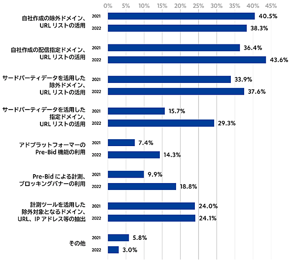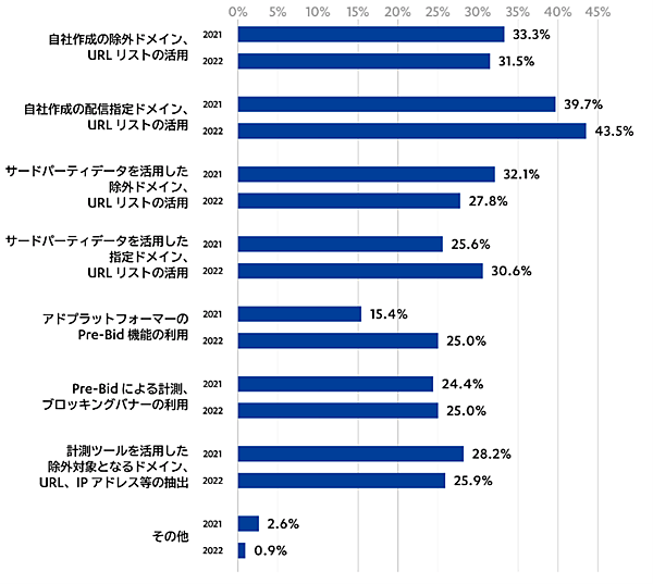 「アドベリ対策をとっている(とったことがある)」と回答したアドバタイザーに「具体的な対策内容」を聞くと、対策ごとの内訳は以下のようになった。基本は自社作成の除外リスト(ブラックリスト)、配信指定リスト(ホワイトリスト)を活用しているが、サードパーティデータ活用もかなり広がっているようだ。一方で計測ツールやPre-Bid機能は今後の活用が期待される。