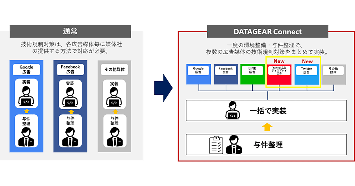 DATA GEAR Connectは、1st Partyデータの計測基盤を中核に、企業のマーケティング活動に応じてデータ戦略策定、運用・導入を支援するコンサルティングサービス。これまでは「Google広告」「Facebook広告」「LINE広告」「Googleアナリティクス4プロパティ」を対象にサービスを提供していた。今回これらに加え、新たにYahoo!広告ディスプレイ広告と、Twitter広告の計測にも対応した。