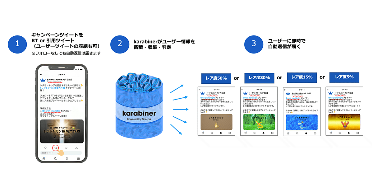 SNSマーケティング支援事業のトーチライトは、同社の「Twitter」キャンペーン支援ツール「karabiner(カラビナ)」に新機能「レアリプライ」を加えた、と1月19日発表した。Twitterキャンペーンへの参加に対して即時に送るリプライ(自動返信)を複数用意する際、リプライごとに出現率を設定できる機能となり、珍しさが演出できる。