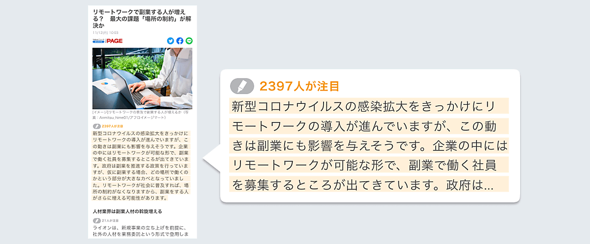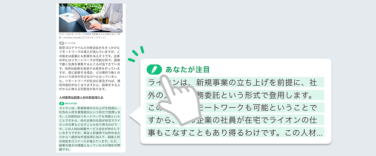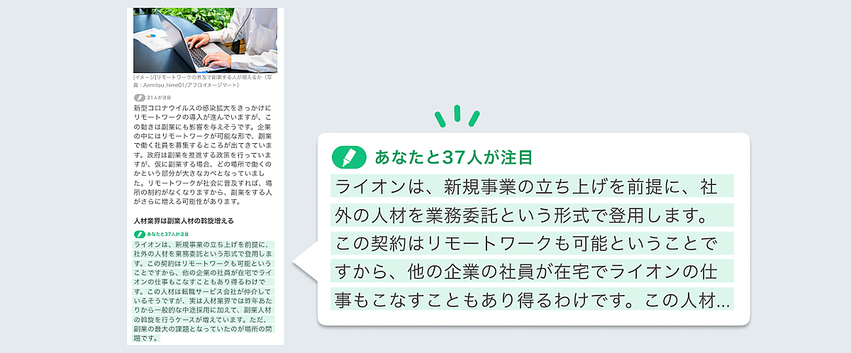 複数のユーザーが同じポイントに注目してハイライトをすると、該当パラグラフに注目した人数が表示される。さらに記事内で最も注目されたポイントは「注目ハイライト」として表示されるので、注目ポイントが一目でわかる。ハイライトの対象は1パラグラフごとだが、1つの記事に複数のパラグラフにハイライトが可能。ハイライトを削除したい場合はペンマークを再度タップすると取り消しできる。