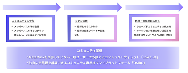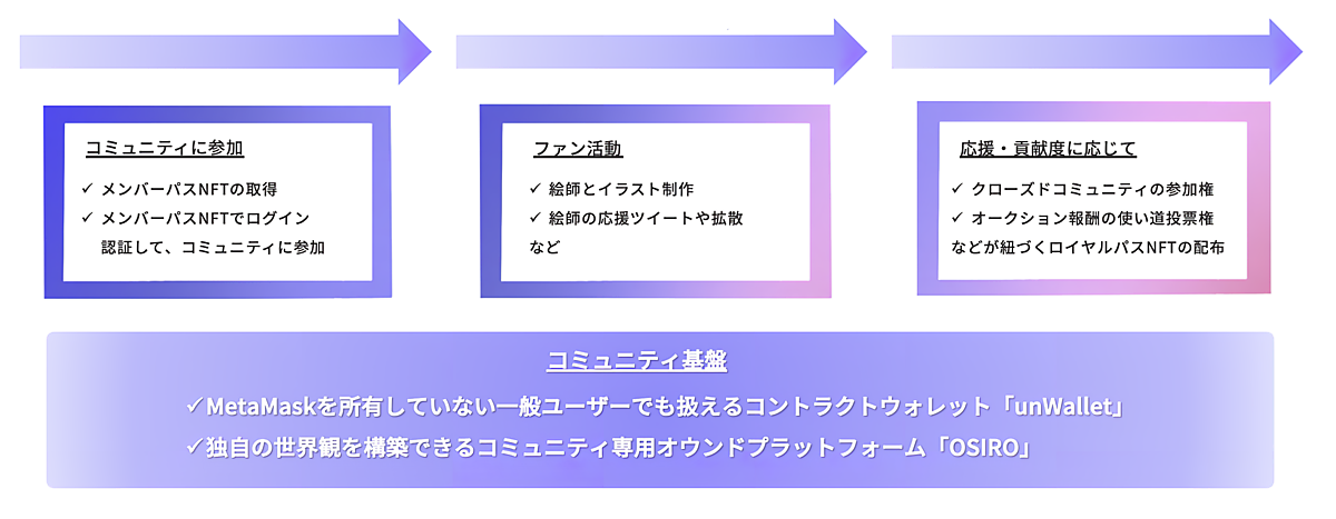 テクノロジーを活用したタレントマッピングに強みを持つハンディデジタルや、NFTプロジェクトを手掛けるSoudan NFT、クリエイターグッズ共創・販売事業の灯白社が参加。「ウォレット」や「暗号資産」の事前準備などユーザーの参加障壁になる難解なUX(顧客体験)を極力排除するため、シビラのNFT用コントラクトウォレット「unWallet」と、オシロのコミュニティ専用オウンドプラットフォーム「OSIRO」を活用する。