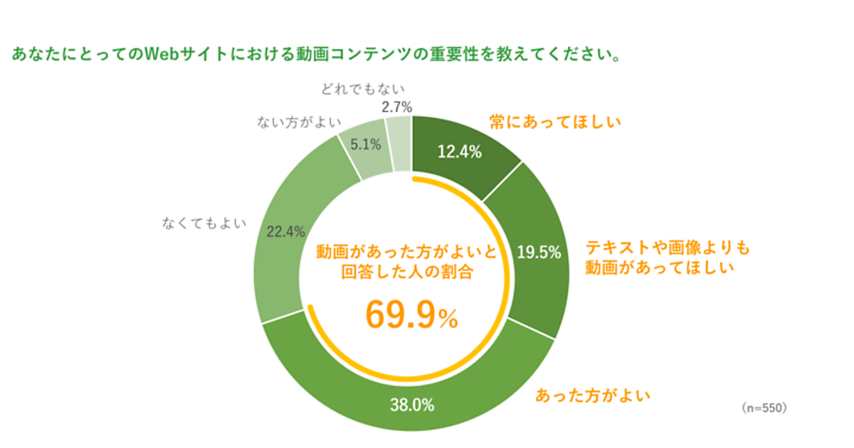 まず「動画コンテンツの重要性」を聞くと、「常にあってほしい」12.4%、「テキスト・画像より動画があってほしい」19.5%、「あったほうがよい」38.0%で、計69.9%が“Webサイトに動画コンテンツがあったほうがよい”と感じていた。