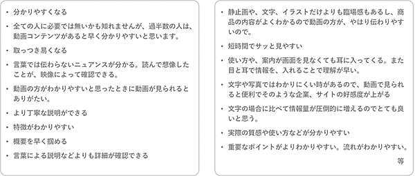 「動画コンテンツがあることで良くなると感じる点」を自由意見で聞くと、「分かりやすくなる」「言葉で伝わらないニュアンスが分かる」「概要を早く掴める」「臨場感」といった声があがった。