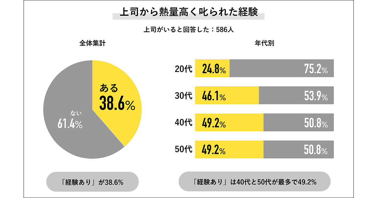 まず、上司から熱量高く叱られた経験について聞くと、「ある」と答えたのは38.6%となった。年代別で見ると、「経験あり」の回答は20代が24.8%と最も低く、年代が上がるごとに高くなる傾向だった。