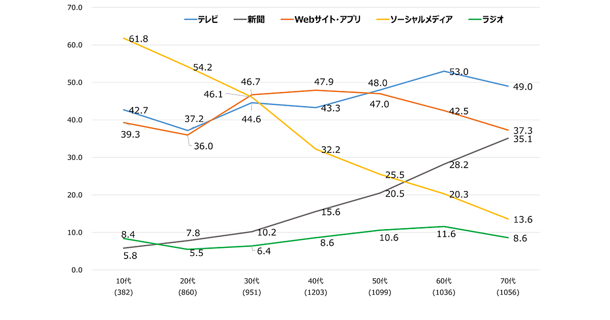 10~20代では「SNS」が半数以上、シニア層は「テレビ」