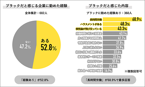 まずこれまでのキャリアで「ブラック企業と感じる企業に勤めた経験」を聞くと、「経験あり」52.8%でわずかに半数を超えた。「ブラック企業での勤務経験あり」と回答した360人に「ブラックだと感じた内容」(複数回答可)を聞くと、「長時間労働」68.9%が特に多く、「ハラスメントがある」48.3%、「根性論が飛び交っている」43.3%がそれに続く。上司の質や関係性よりも、企業体質自体を問題視する人が多いようだ。