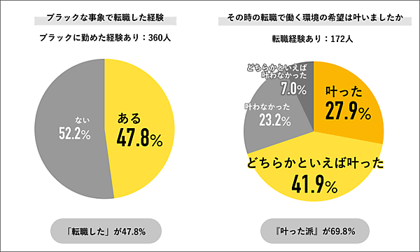 続いてこの360人に、「ブラックな事象が原因での転職経験」を聞くと、「経験あり」47.8%、「経験なし」52.2%でほぼ半々。「転職経験あり」と回答した172人に「その転職によって環境の希望は叶ったか」を聞くと、「叶った」27.9%、「どちらかといえば叶った」41.9%で、とりあえず転職は成功したようだ。