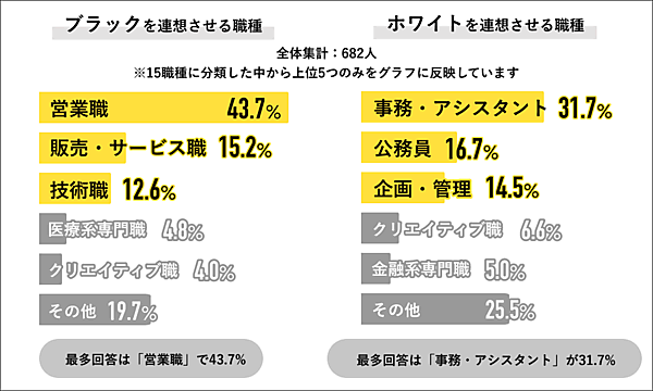 なお「ブラックな労働環境を連想させる職種」「ホワイトな労働環境を連勝させる職種」を聞くと、ブラックを連想させる職種は「営業職」43.7%が最多、ホワイトを連想させる職種は「事務・アシスタント」31.7%が最多だった。