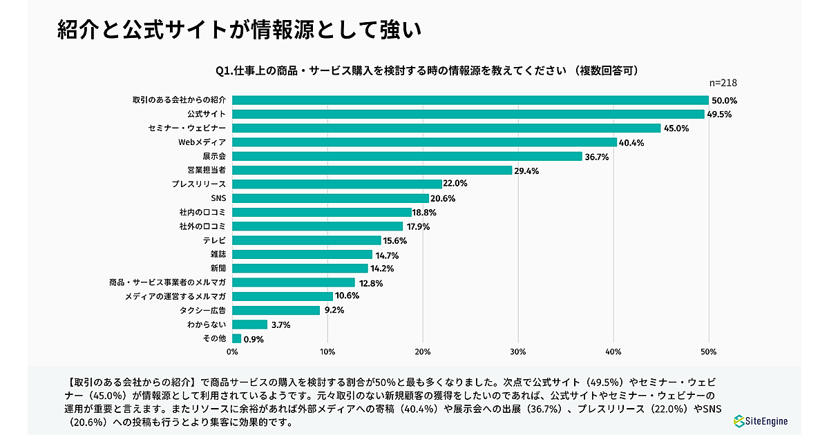 「仕事上の商品・サービス購入を検討する時の情報源」については、「取引のある会社からの紹介」50.0%、「企業公式サイト」49.5%が特に多く、「セミナー・ウェビナー」45.0%がそれに続く。