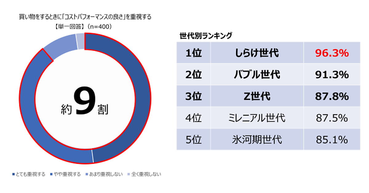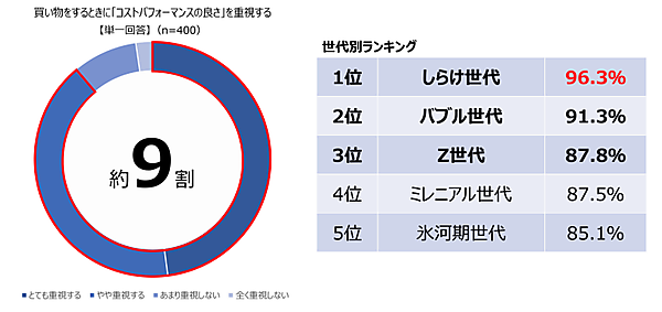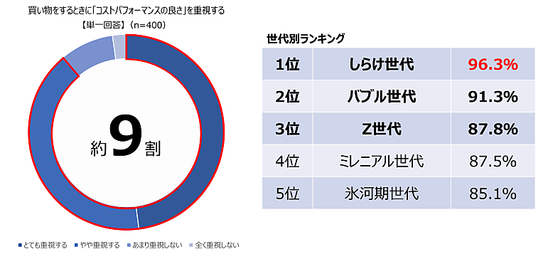 まず「買い物をするときに『コストパフォーマンスの良さ』を重視するか」と聞くと、「とても重視する」48.0%+「やや重視する」40.8%で9割近くが重視。世代別では、しらけ世代(58~69歳)、次いでバブル世代(52~57歳)と、高齢者ほどコスパを重視していた。