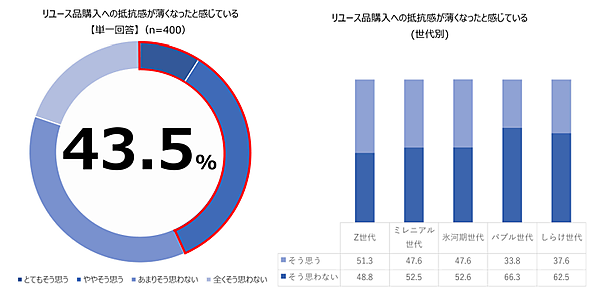 「リユース(中古)品を購入することへの抵抗感が以前と比べて薄くなったと思うか」という質問では、「とてもそう思う」9.0%+「ややそう思う」34.5%で、4割以上で抵抗感が薄れている。特に世代別では、Z世代の2人に1人以上(51.3%)が「薄れている」と回答した。なおバブル世代は33.8%にとどまり、かなりの差異が見てとれる。