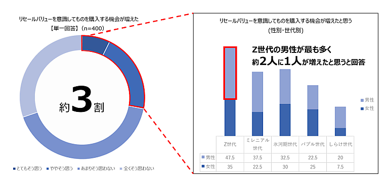 特に「買い物をするときにリセールバリューを意識して商品を購入することが増えたように思うか」という設問では、「とてもそう思う」7.3%+「ややそう思う」20.8%と、約3割が購入時にすでに手放すことを想定しているという。世代別では、Z世代の男性が「とてもそう思う」17.5%+「ややそう思う」30.0%と最も高く、約2人に1人がリセールバリューを意識していた。