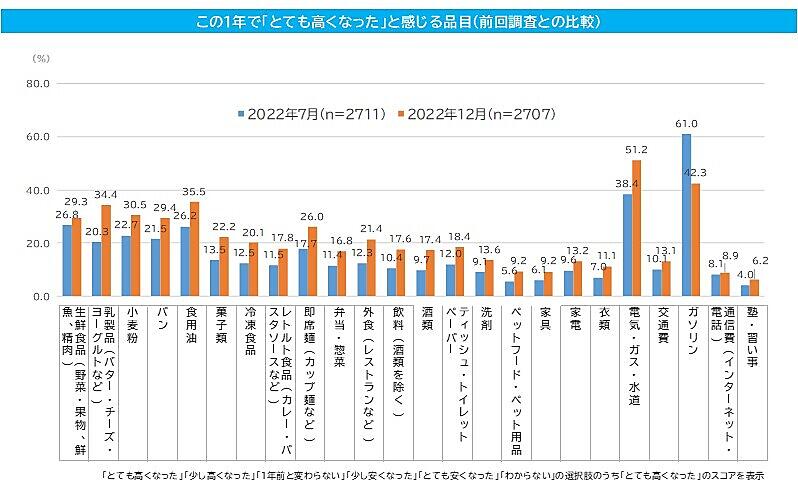 総務省の消費者物価指数の総合指数によると、2021年の終わりごろから物価上昇が続いているという。同所では2022年7月にも同種の調査を行っており、その結果と今回(2022年12月)の結果を比較した。その結果、「思った以上に価格が上昇している」という感想が、7月では63.7%だったのが12月には70.1%まで増加していた。