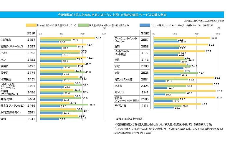 「今後の購入についての考え」を聞くと、「引き続き購入する(購入量は減少しない)」という品目と、「購入量・頻度を減らして引き続き購入する」という品目とで、大きく2つに分かれた。