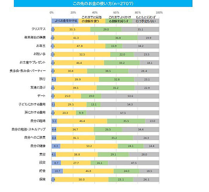 さらにイベントやテーマごとに「この先のお金の使い方」について聞くと、全体的には「これまでと同等の金額を使う」「これまでよりかける金額を減らす」といった回答が多い。一方で「よりお金をかける」という品目としては「貯金」10.7%、「自分の健康」8.3%などがあがった。