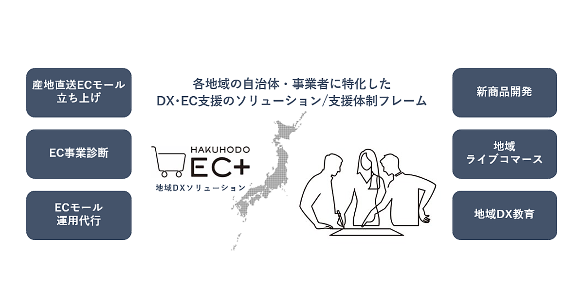 博報堂のECに特化した組織横断型プロジェクト「HAKUHODO EC+」は、地方自治体・事業者のDX(デジタル変革)とECを支援する「地域DXソリューション」の提供を始めた、と2月6日に発表した。博報堂DYグループ「ショッパーマーケティング・イニシアティブ」が①産地直送ECモール立ち上げ、②EC事業診断、③ECモール運用代行、④新商品開発、⑤地域ライブコマース、⑥地域DX教育――の6つのソリューションを提供する。