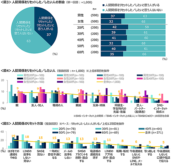 自ら長期的に連絡を絶つ「人間関係リセット」について聞くと、「人間関係をリセットした/したい人がいる」のは37%だった。女性、30代・50代は4割を超える。リセットした/したい対象はさまざまだが、男性30代で「親」、女性30代で「友人・知人」、女性60代で「兄弟・姉妹」が目立つ。