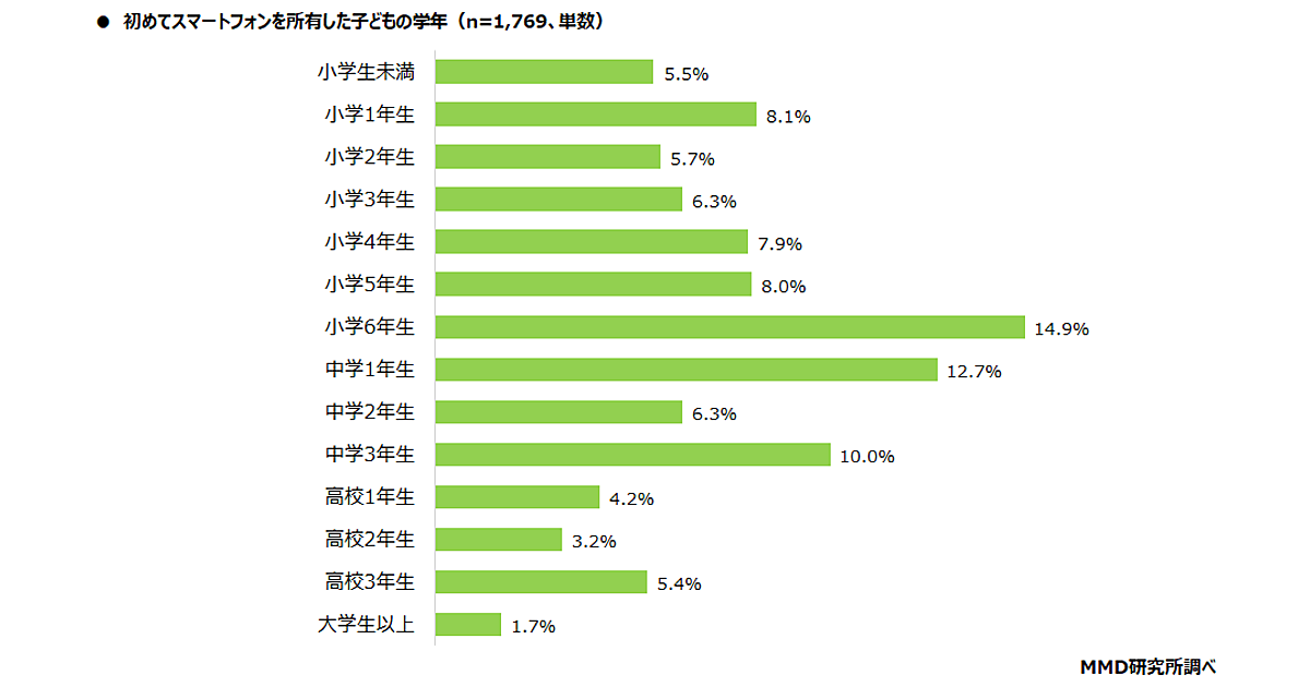 まず事前調査(n=1,769)で「子供に初めてスマートフォンを持たせた学年」を聞くと、もっとも多かった回答は「小学6年生」14.9%、次いで「中学1年生」12.7%、「中学3年生」10.0%だった。中学生になったことを契機に記念としてスマホを与える親が多いイメージだったが、小学生時点の合計は半数を超え、近年は小学生時点でスマホを与える親が多数派であると判明した。