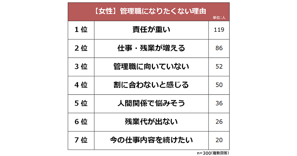 まず、女性に「管理職になりたくない理由」を聞いたところ、1位は「責任が重い」で、4割近くにのぼった。2位は「仕事・残業が増える」、3位は「管理職に向いていない」と続いた。