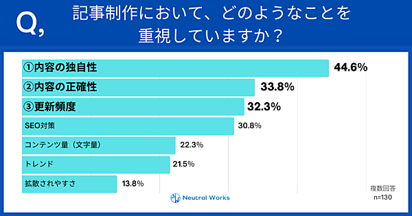 一方「記事制作において重視していること」を聞くと、「内容の独自性」44.6%、「内容の正確性」33.8%、「更新頻度」32.3%が上位だった。