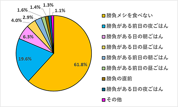 まず全体の1,000人に「勝負メシを食べたことがあるか」と聞くと、「ある」としたのは30.2%。「勝負メシを食べるタイミングはいつか?」に対し、「勝負メシを食べない」61.8%を除くと、「勝負がある前日の夜ごはん」19.6%が最多、以下「勝負がある日の朝ごはん」6.3%、「勝負がある日の昼ごはん」4.0%で、“前日の夜食”が多かった。