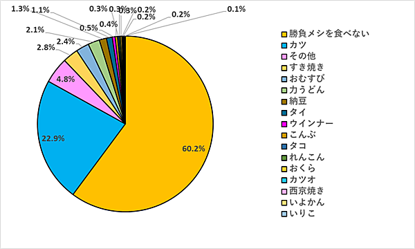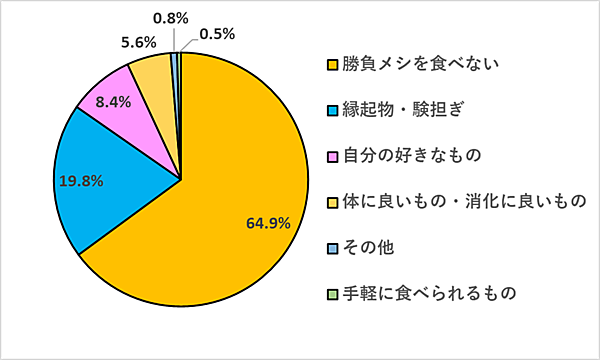 「勝負メシを選ぶときにもっとも重要視すること」を全体に聞くと、「食べない」を除く全体では、「縁起物・験(げん)担ぎ」19.8%、「自分の好きなもの」8.4%が上位だった。