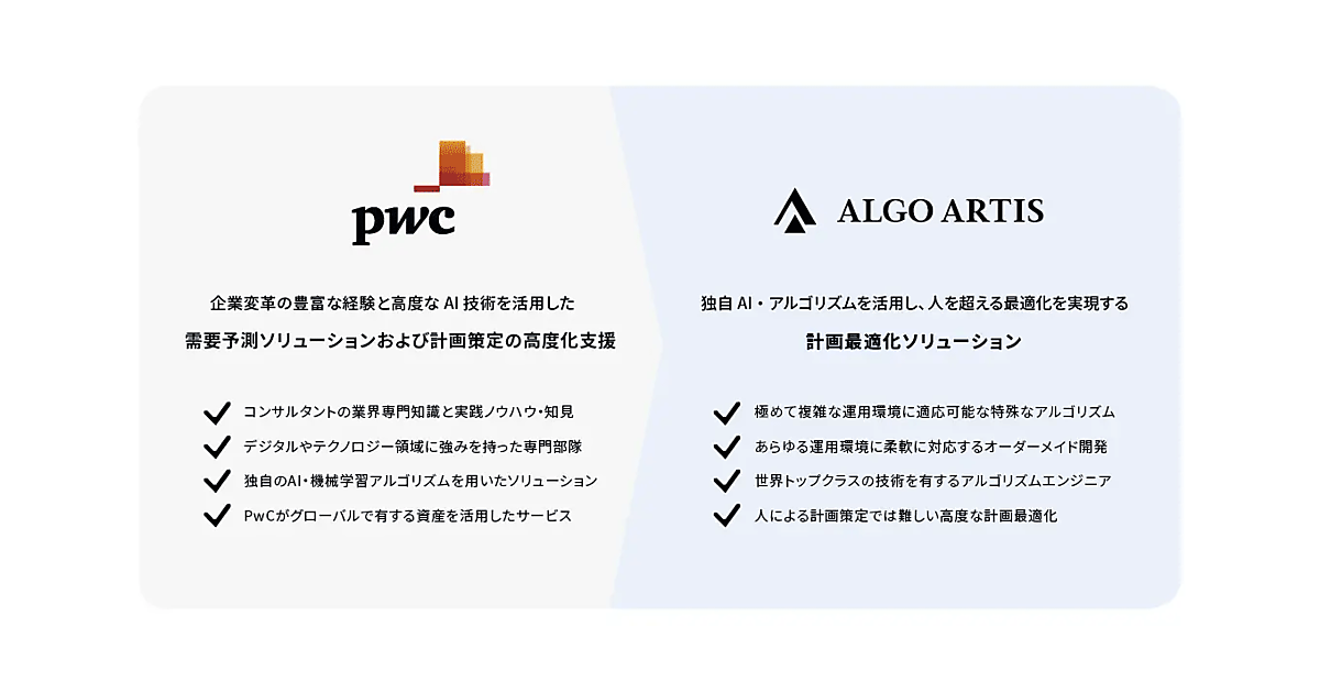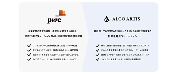PwCコンサルティングがAI経営推進への戦略策定と次世代型需要予測ソリューション「Multidimensional Demand Forecasting(MDF)」を、ALGO ARTISが計画最適化ソリューション「Optium」を開発・提供し、計画業務の「予測・最適化ソリューションパッケージ」を展開。PwCアドバイザリーは、需要予測サービスのほか、ALGO ARTISと計画策定の高度化を支援する。