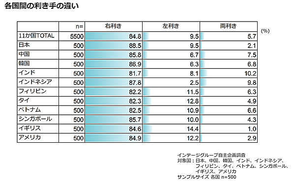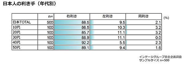 まず一般的な「右利き」と「左利き」の比率を見ると、日本の場合、右利きが88.5%、左利きが9.5%、両利きが2.1%だった。年代別で差異はあるが、おおむね1割強が左利き/両利きだ。海外と比較しても極端な違いはない。