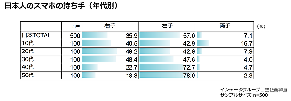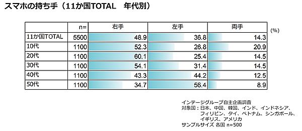 続いて「スマホをどちらの手で持っているか」を聞くと、日本では10代~30代は右手持ち・左手持ちが半々だが、40代~50代は7割以上が左手持ちだった。