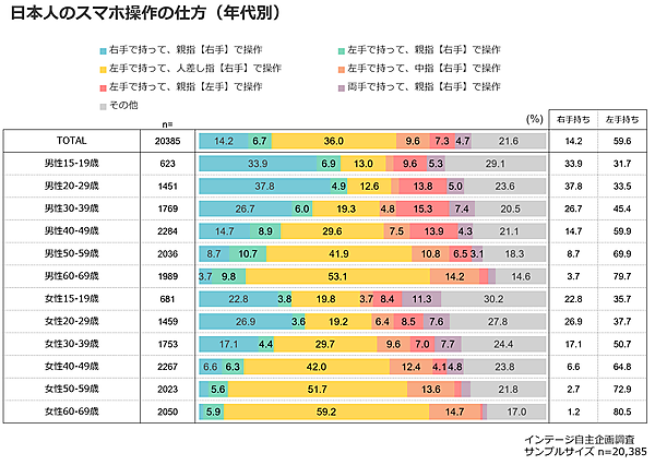 インテージ(R&Dセンター)は、「スマホの持ち手」に関する研究結果を発表した。スマホ操作の国際比較、持ち手と指の組み合わせ、スマホ操作の仕方などについて調査した結果を11か国で比較したほか、日本国内の3万超のサンプルについて集計している。