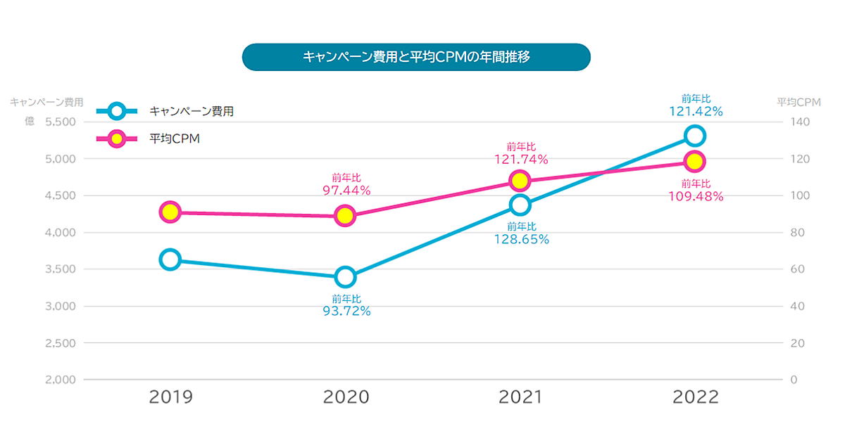 2022年の運用型ディスプレイ広告のキャンペーン費用は前年比121.4%、平均CPM※は前年比109.5%と、ともに上昇傾向にあった。2019年以降市場が一時停滞したものの、徐々に回復していることがうかがえる。