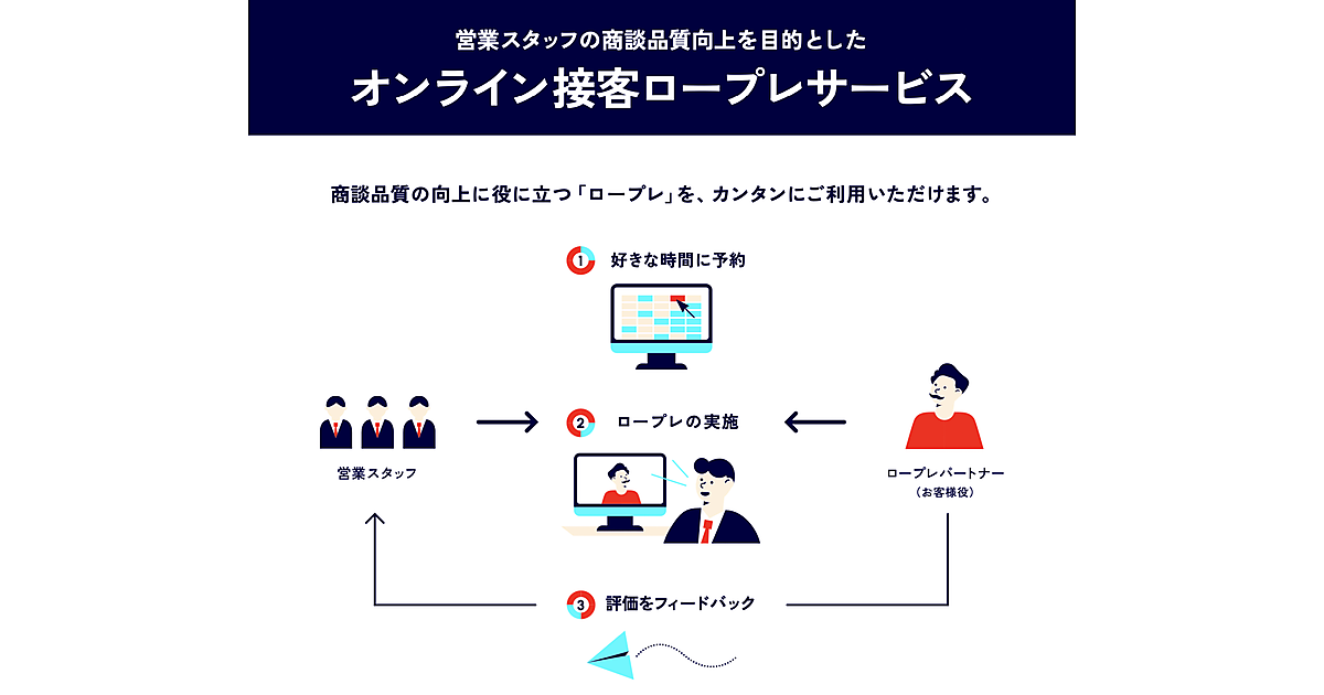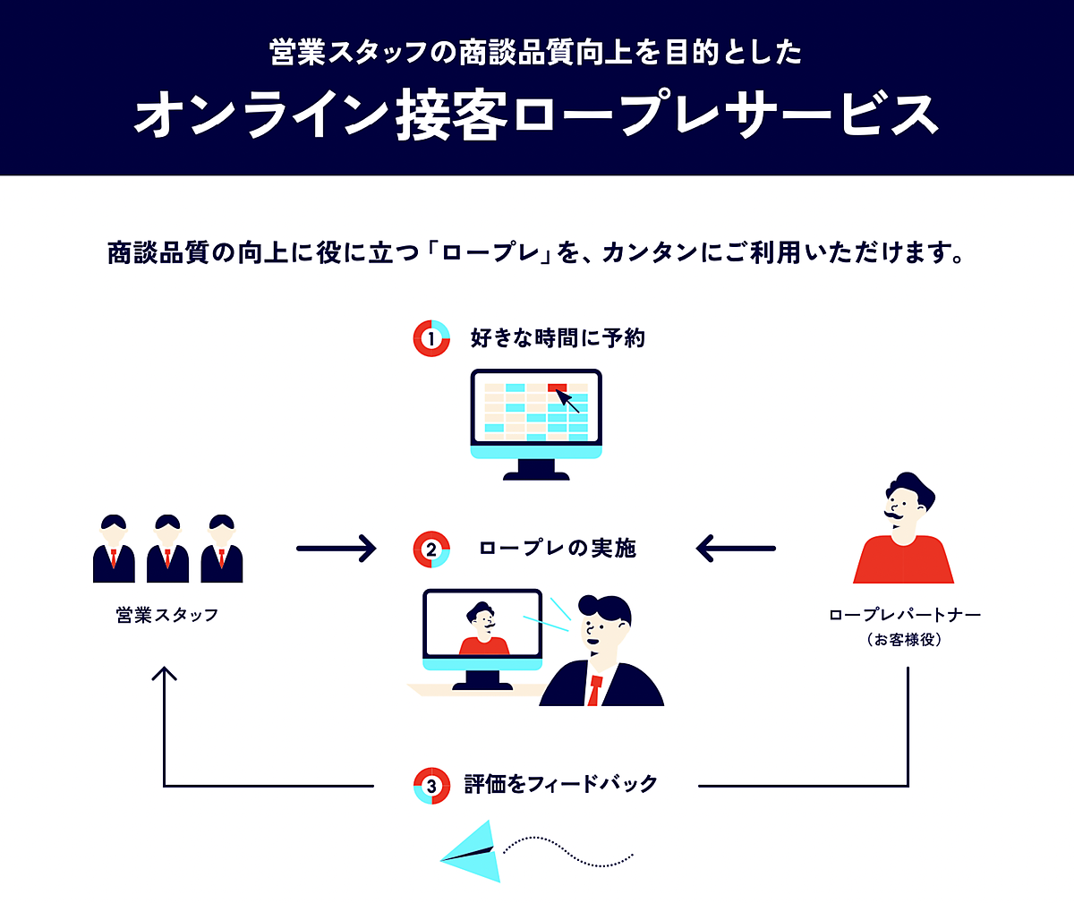 オンライン接客ロープレサービスは、シナリオ作成、ロープレパートナー(顧客役)の育成、営業・接客技術評価指標の作成、オンライン受講の環境・システム整備を一括して提供する。営業スタッフは都合のいい時間に予約し、好きな場所でオンライン受講できる。シナリオは企業の商品・サービスに合わせて作る。録画データの見直しや共有も可能。