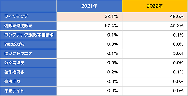 ネット詐欺の手口では「フィッシング詐欺」が増加し、ほぼ半分を占めた。一方「偽販売・違法販売」は減少しフィッシングを下回った。2022年の特徴としては、これまでに無かった「国税庁」「えきねっと」といったブランドを狙う詐欺が増加していた。