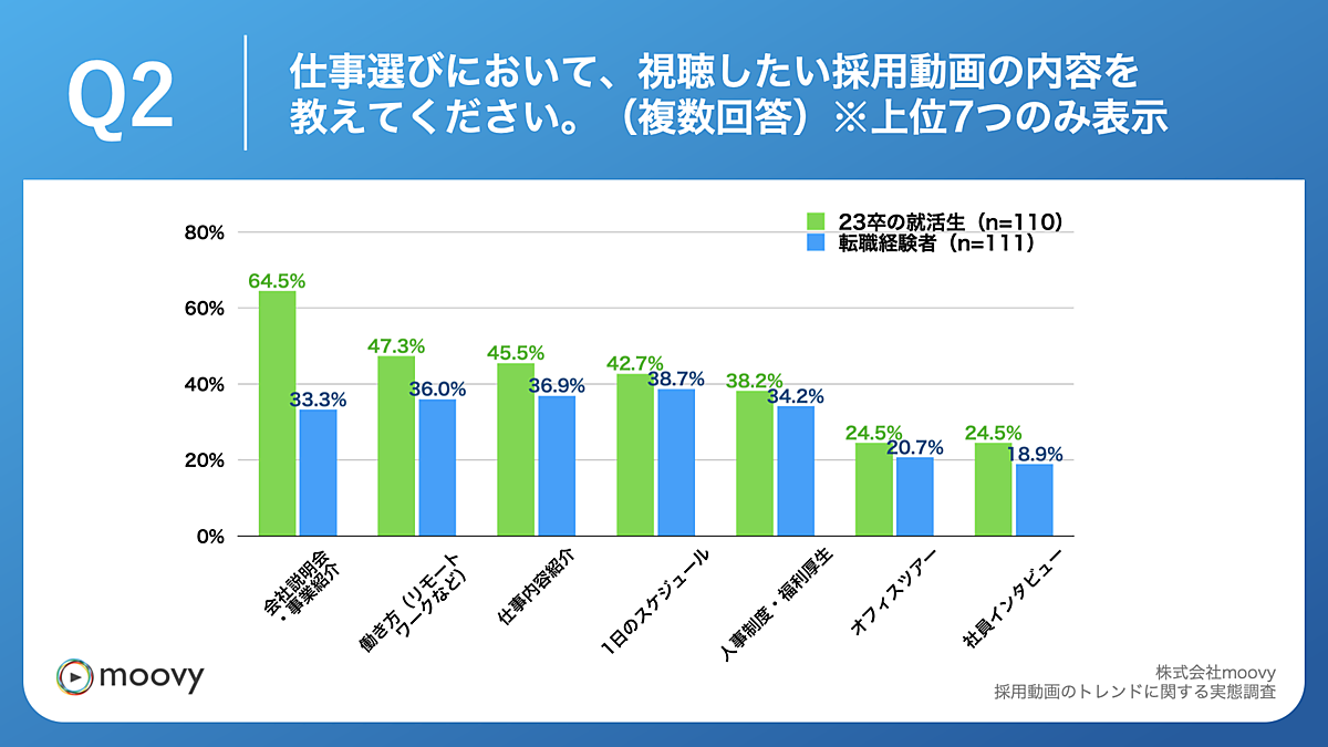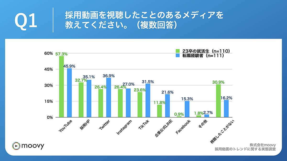moovyは、「採用動画のトレンド」に関する実態調査の結果を発表した。2023年卒の就活生110人、直近1年以内の転職経験者111人、合計221人が回答している。