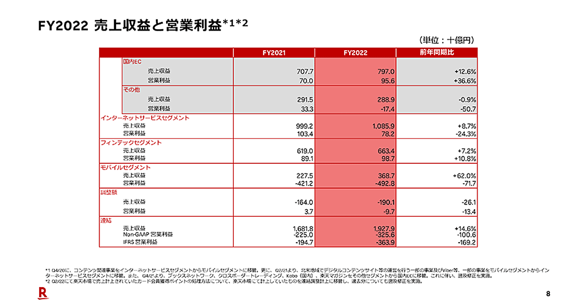 楽天グループは、2022年12月期の連結決算を2月14日発表した。売上高にあたる売上収益は前期比14.6%増の1兆9278億7800万円と過去最高を記録。インターネットサービス、フィンテック(金融技術)、モバイルの各事業分野で増収だった。一方、最終損益は3728億8400万円の赤字となった。赤字は前期の1338億2800万円から3倍近くに広がって過去最大。モバイルへの投資が影響した。