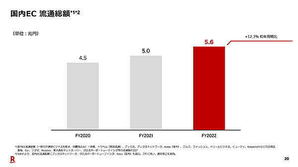 インターネットサービスは、ネット通販の「楽天市場」や旅行予約サイト「楽天トラベル」が好調で、売上収益は前期比8.7%増の1兆859億円だった。国内のEC流通総額は同12.3%増の5兆6000億円となり、特に楽天トラベルの国内宿泊流通総額は、新型コロナウイルスの感染が広がる前の2019年比で2桁の成長だった。楽天市場や楽天トラベルを中心に広告売り上げも大幅に伸びた。