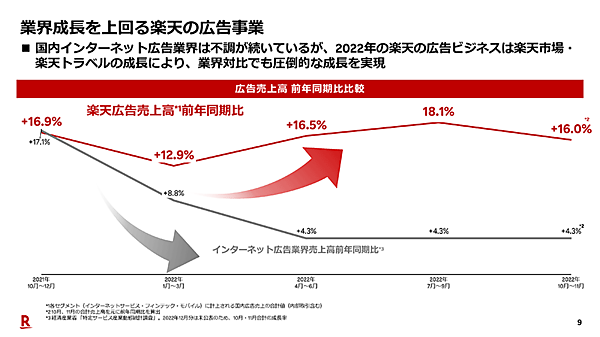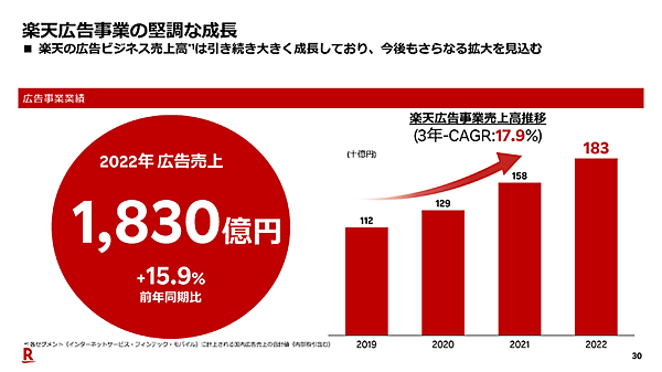 国内広告業界の不調が続いている中、楽天の広告ビジネスの売り上げは、楽天市場や楽天トラベルなどオンライン広告の受注拡大から、前期比15.9%増の1830億円となった。広告売り上げは増加が続いていて堅調。今後も一層の拡大を見込んでいる。広告ビジネスの売上高は、インターネットサービス、フィンテック、モバイルに計上される内部取引含めた国内広告売り上げの合計値。
