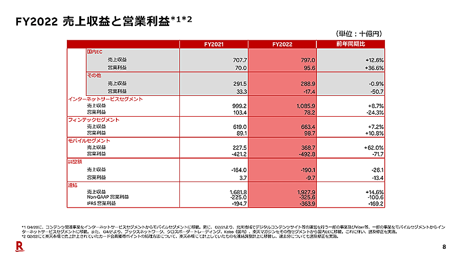 フィンテックの売上収益は前期比7.2%増の6634億円。クレジットカード「楽天カード」の発行枚数が2808万枚(2022年12月)になり、ショッピング取扱高は同25.8%増の年間18兆2000円に達した。3000万枚、30兆円の目標に近付いた。オンラインバンク「楽天銀行」の単体口座数は1339万を超え、オンライン証券「楽天証券」の総合証券口座数も864万に増加し、顧客基盤が拡大した。