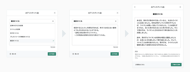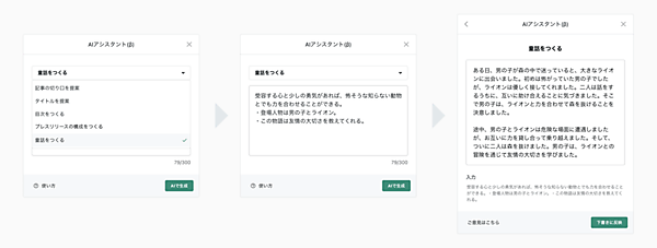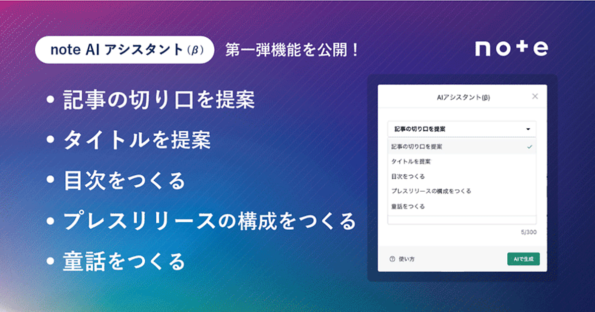 デジタルコンテンツ企画・制作・配信事業のnoteは、チャットAI(人工知能)を使った創作支援ツール「note AIアシスタント(β)」の機能を2月16日に公開した、と同日発表した。第1弾として①記事の切り口を提案②タイトルを提案③目次をつくる④プレスリリースの構成をつくる⑤童話をつくる--の5種類の機能をテストする。今後、機能を順次追加する。