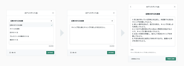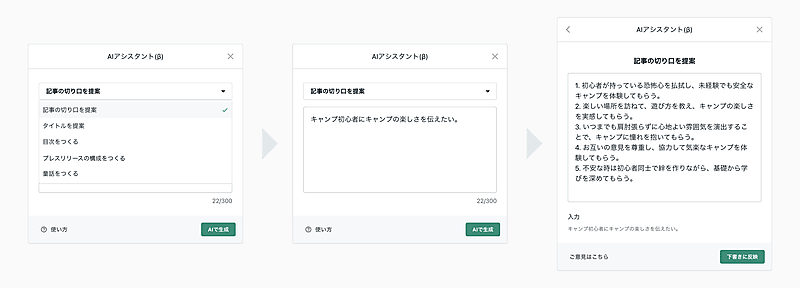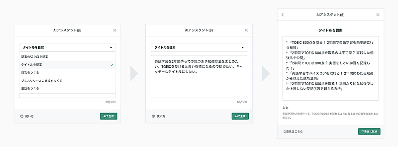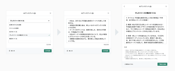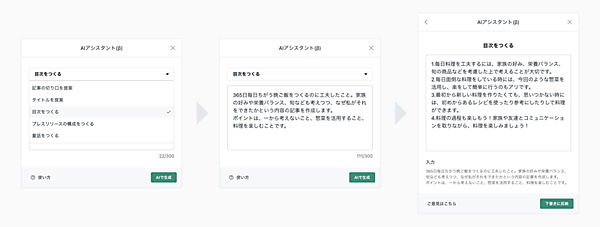 公開した機能の①は、書きたいテーマを入力すると「これについて書いてはどうですか?」と切り口を5つ提案。②は、記事の概要を入力するとタイトル案を5つ表示。③は、記事の概要を入力することで、どの項目をどんな順番で書けばいいか目次と併せて提案する。④は発表内容の概要、サービス、ターゲット、今後の展望などを入力すると構成案を提示する。