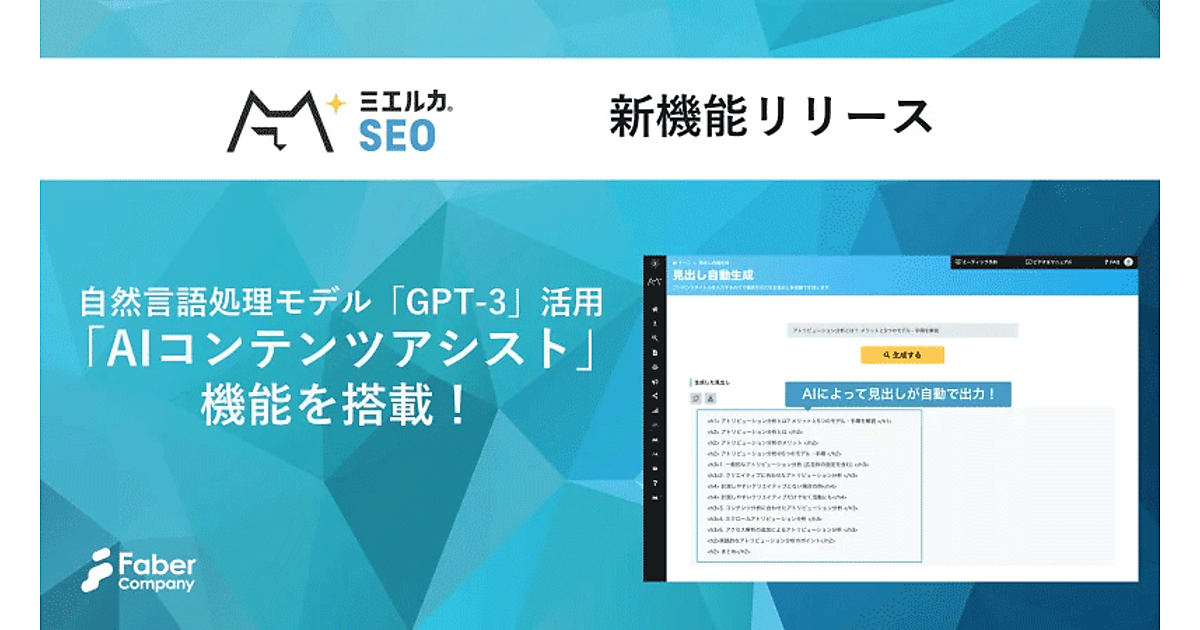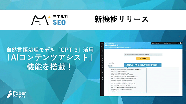 ウェブマーケティング支援事業のFaber Company(ファベルカンパニー)は、同社のSEO(検索エンジン最適化)管理分析ツール「ミエルカSEO」に、AI(人工知能)を利用して企業のウェブサイトやオウンドメディアに合わせたコンテンツを提案する機能「AIコンテンツアシスト(α)」を搭載した、と2月16日発表した。自然言語処理モデル「GPT-3」を活用した。
